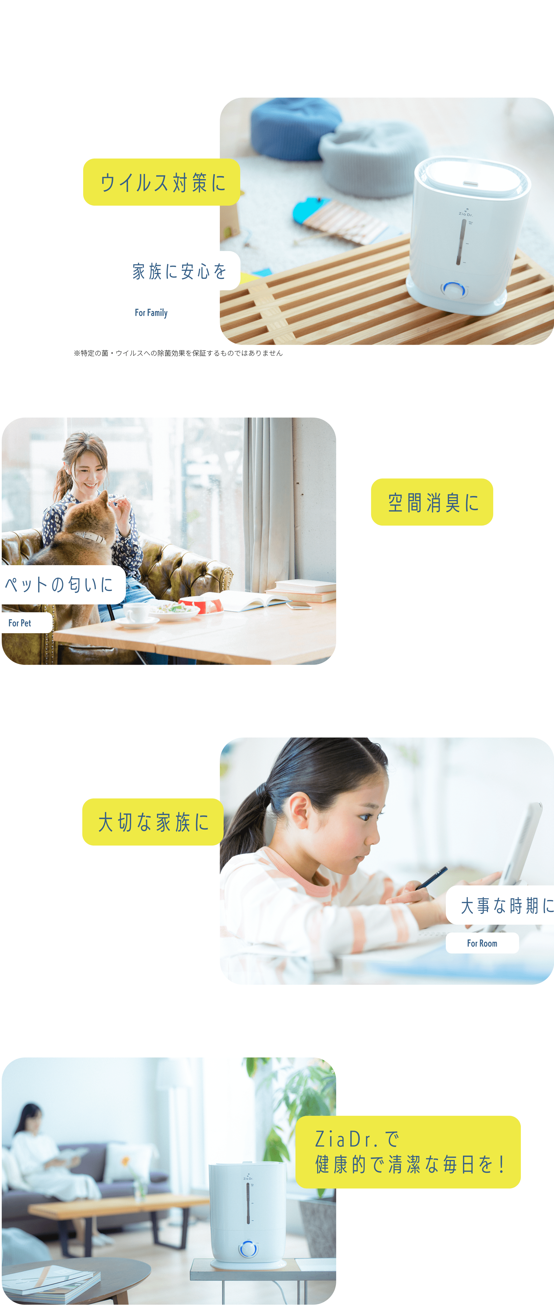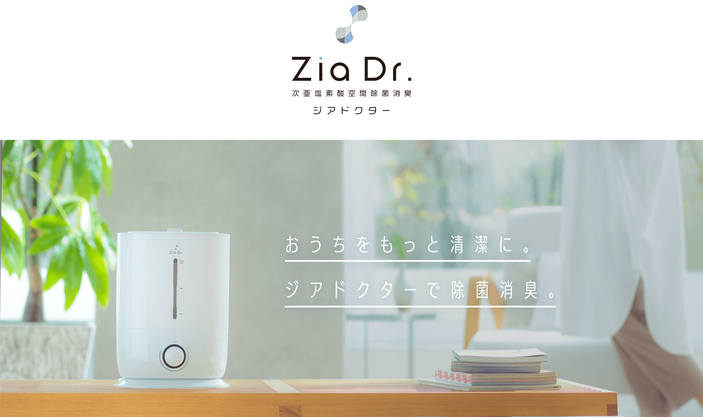 ZiaDr.は次亜塩素酸水を空間に噴霧することで、 ウイルスやニオイの対策にお使いいただけます。 大切なご家族に安全で安心できる空間をお届けします。